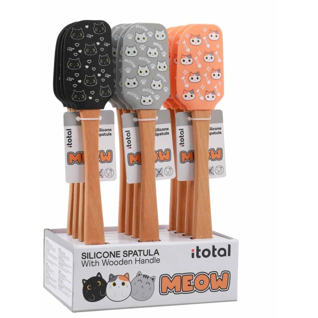 Silicone kitchen spatula with a wooden handle, perfect for everyday use. Available in various cat-themed designs, it combines practicality with a playful look. Made from high-quality silicone, it is heat-resistant and easy to maintain.